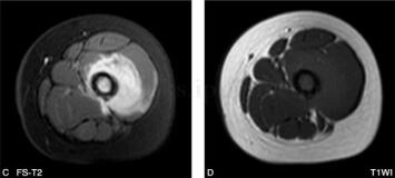 女,5岁,左下肢疼痛月余,近日加重,左下肢活动受限。病来无发热盗汗,无结核接触史。查体:左大腿肿胀,皮温略高,有压痛(图1、图2)。