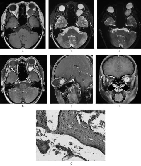 2.脑膜瘤肿瘤通常发生在球后,MRI检查无论T1WI、T2WI还是DWI上,均呈等信号,增强扫描病变显著强化,内部极少出现囊变。