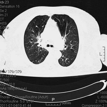 患者,女性,76岁。主因“反复咳嗽、咳痰30年,呼吸困难4天,加重1天”于2011年6月28日就诊于急诊科。患者于30年前无明显诱因下出现咳嗽、咳痰,咳嗽呈阵发性,以晨起及夜间明显,痰为白色黏痰,量中,可咳出,无胸闷、气促,无胸痛,无咯血,无发热、畏寒,无恶心、呕吐,无腹痛、腹胀。30年来上述症状反复发作,迁延不愈,且逐渐加重,曾诊断为慢性阻塞性肺疾病在笔者医院多次住院治疗,均好转出院。4天前,患者因受凉后再次出现咳嗽、咳痰,为黄白色黏痰,伴胸闷、气急,呼吸困难,活动后加重,休息后稍缓解,昨起出现意识淡漠,呼唤无反应,今遂来笔者医院急诊。来院时神志不清,呼吸促,口唇发绀明显,急行气管插管、机械通气,约半小时后患者意识转清。查胸部CT示两肺感染性病变,两下肺支气管扩张伴感染。血气分析(机械通气前):pH 7.11,PaCO2 127mmHg,PaO2 61mmHg。予头孢哌酮-舒巴坦钠抗感染,以及化痰、解痉平喘等处理。患者机械通气后出现血压下降,最低至75/48mmHg,予充分扩容补液,加用多巴胺升压处理后血压稳定。复查血气分析:pH 7.34,PaCO2 42mmHg,PaO2 70mmHg。既往慢性阻塞性肺疾病病史30余年,高血压病史10年;2型糖尿病病史1年。否认药物、食物或其他特殊过敏史。个人史、婚育史、家族史均无特殊。