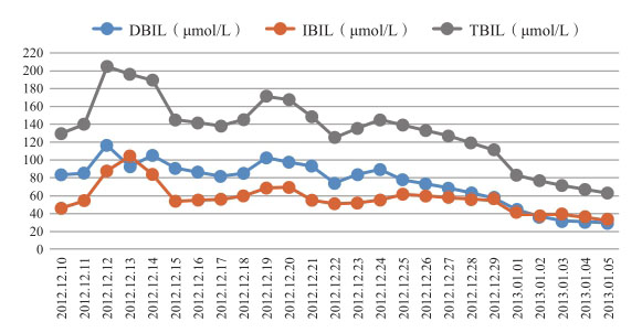 肝功能:白蛋白于术后1周达到30g/L,转氨酶轻度升高,胆红素反复波动,术后第4天最高(204.6µmol/L),与患者感染症状出现时间密切相关,与CRP变化规律相似(图10、图11)。