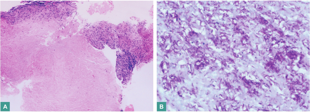 镜下见大片干酪样坏死,周边见上皮样细胞肉芽肿结节及多核巨细胞(HE染色)(A. ×100),抗酸染色阳性(B. ×200)