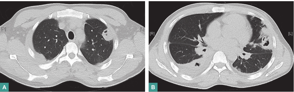 胸部CT可见双肺多发高密度斑片状实变影,其间可见坏死性空洞改变