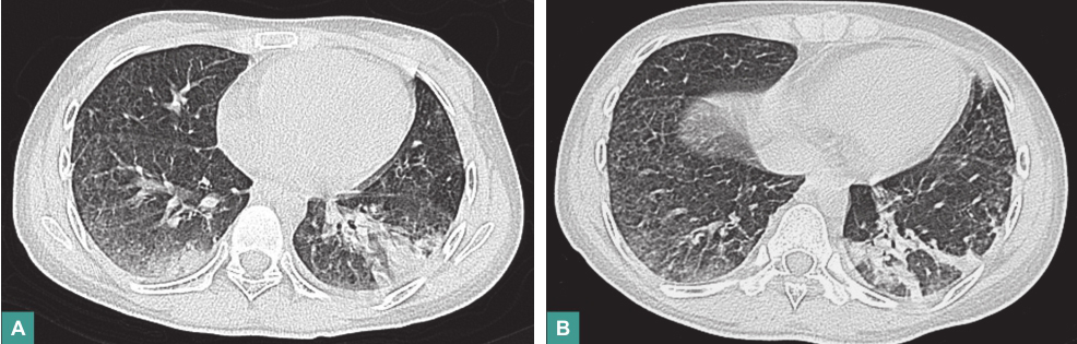 SLE的肺部病变按发生率依次为胸膜炎/胸腔积液、间质性肺炎、肺动脉高压、小气道病变、急性狼疮肺炎、肺出血、肺挛缩综合征、肺栓塞等,常并存感染。本例患者胸部CT提示肺部弥漫性病变,暂无法鉴别其性质,可在治疗SLE的同时,积极抗感染,并密切随诊肺部情况。